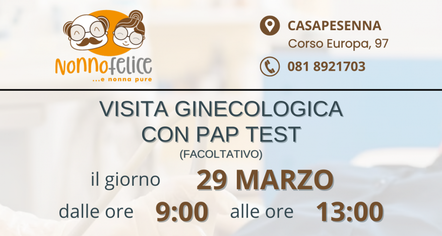 In data 29 Marzo dalle ore 9:00 fino alle 13:00 ti aspettiamo per una visita ginecologica con pap test (facoltativo) presso Nonno Felice a Casapesenna, Corso Europa 97. Per informazioni e prenotazioni, chiama lo 081 8921703.